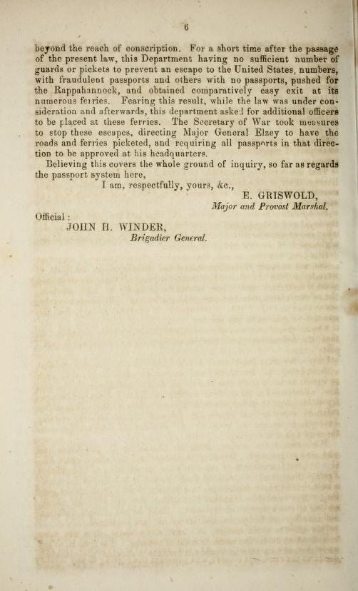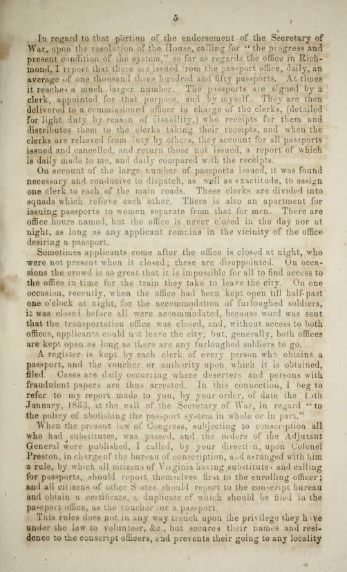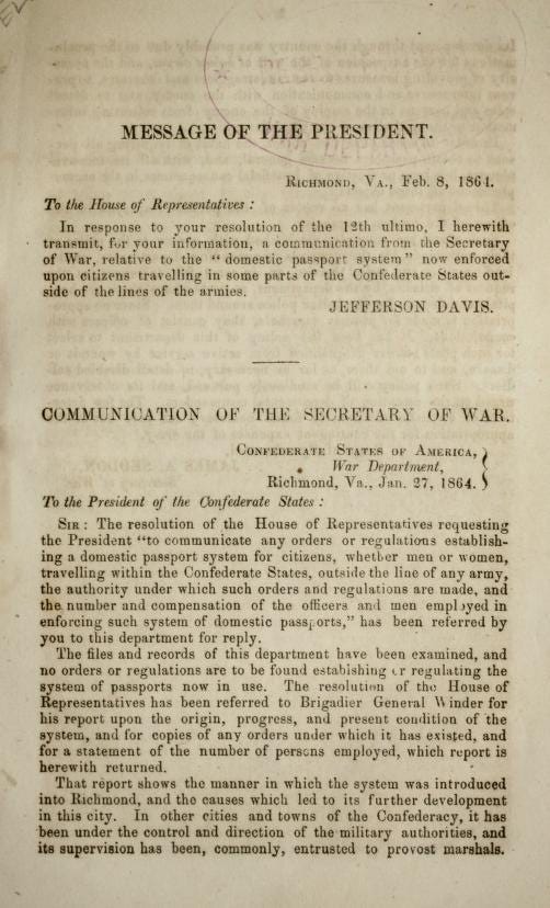 “Communication of the Secretary of War relative to the ‘domestic passport system’ enforced upon citizens.”