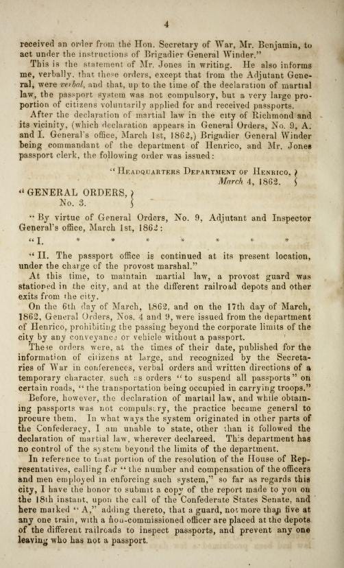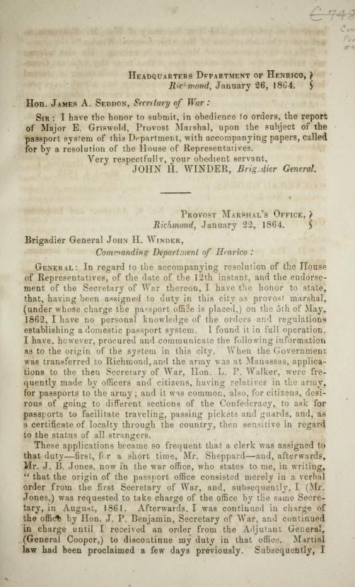 With Brigadier General Winder as commandant and Mr. Jones overseeing the passport office, orders were issued to maintain oversight: provost guards were stationed throughout the city, at railroad depots, and at every exit.