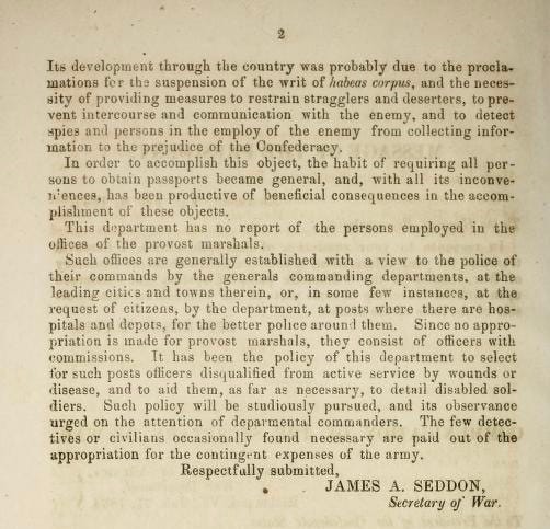 Its development across the Confederacy was closely tied to wartime necessities: the suspension of habeas corpus*, the need to restrain stragglers and deserters, the prevention of communication with the enemy, and the detection of spies.